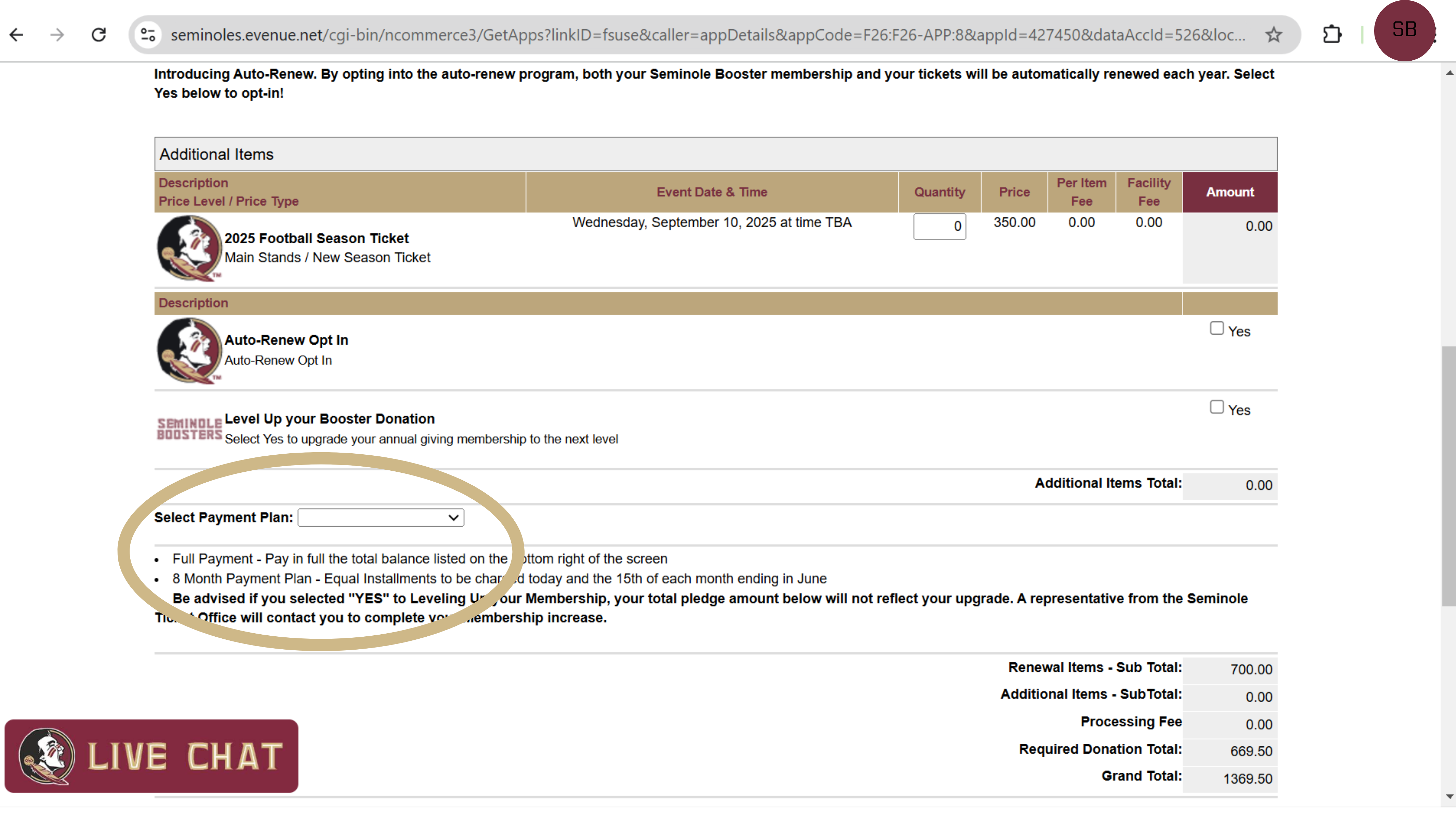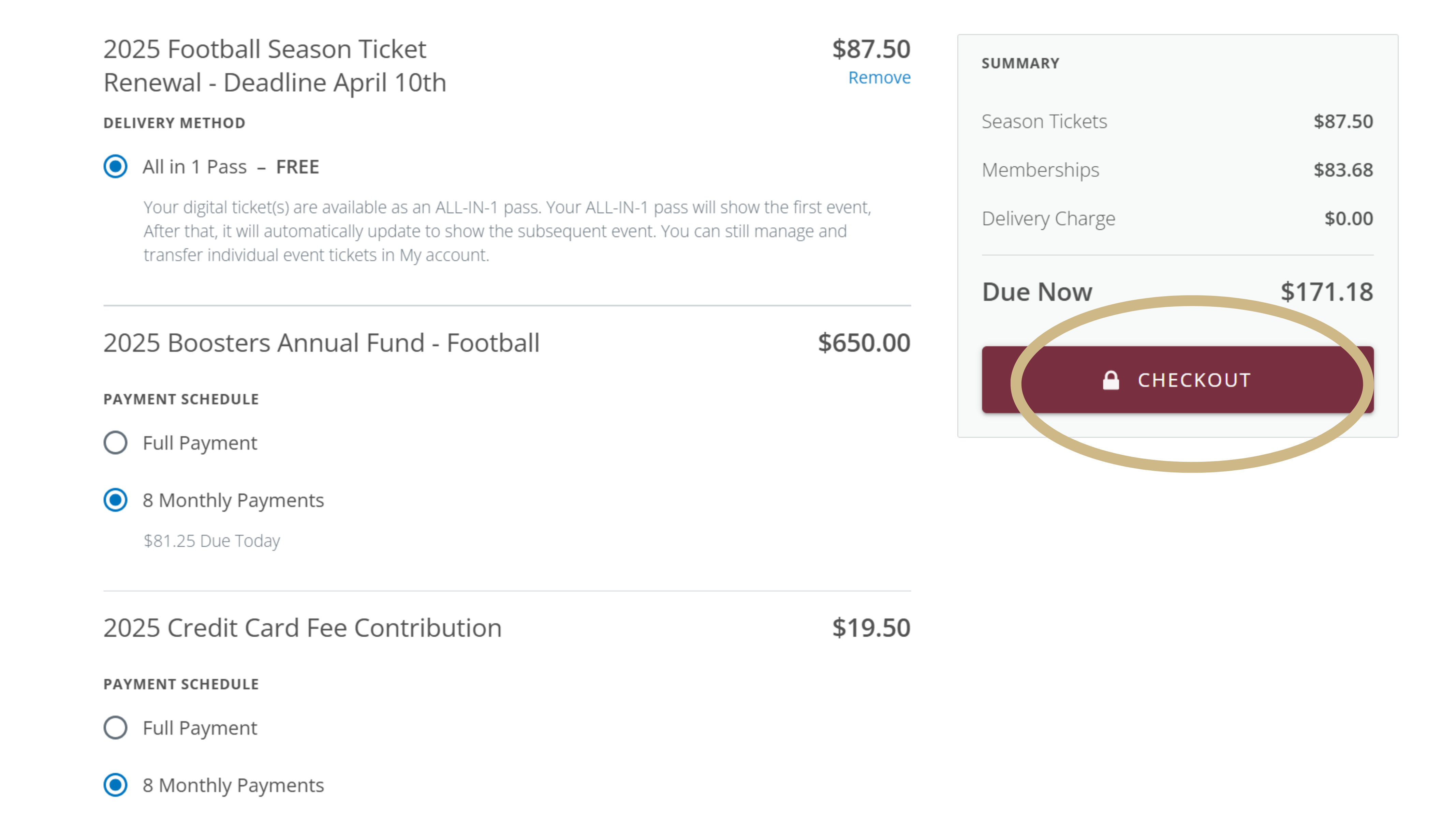 You will also be able to add on new season tickets, opt-in for auto-renew, and upgrade your annual Booster membership level. Before you move onto the next step, you must select your ticket payment plan - either pay in full or over 8 months.