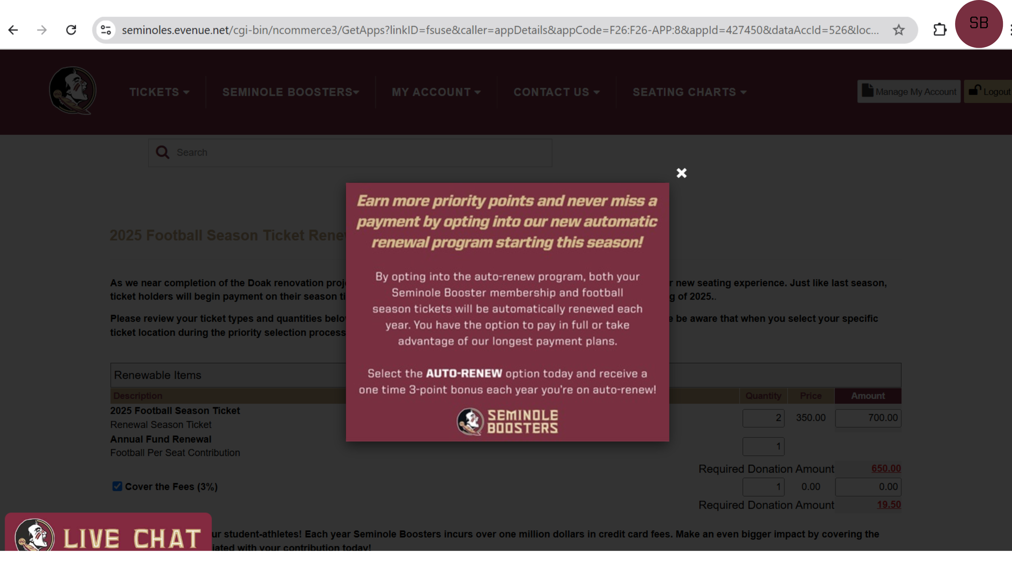After clicking the "2025 Football Season Ticket Renewal" application, you will receive the following pop-up message regarding auto-renewal. After reviewing the message, you can click the "X" in the corner to close it out and move onto the application.
