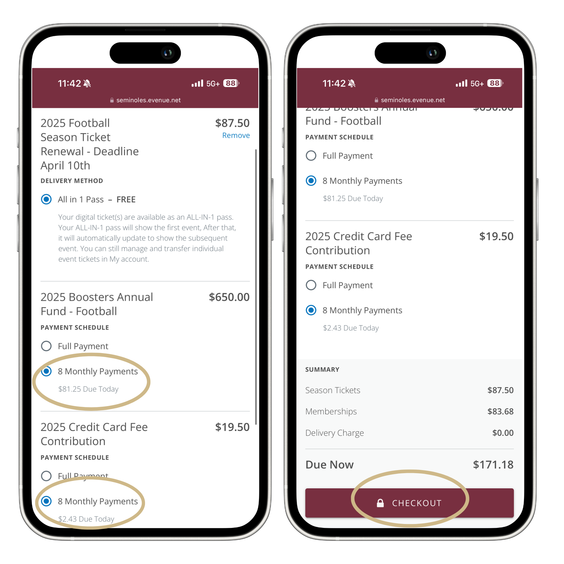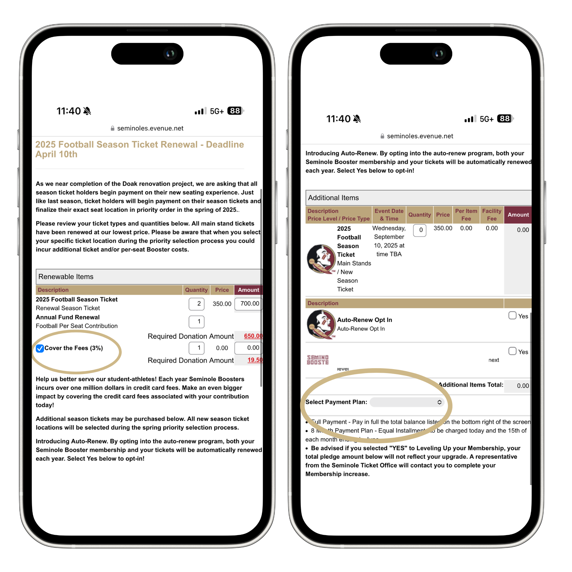 You will also need to make a few different decisions before completing payment: covering the 3% credit card fee, adding any additional season tickets, opting in for auto-renewal, and selecting your ticket payment plan (either pay in full or over 8 months).